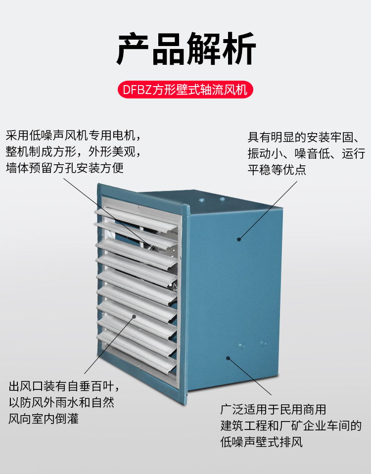 JVF-AM側(cè)壁式排風機采用低噪聲外轉(zhuǎn)子電機與前掠型軸流風葉直聯(lián)驅(qū)動;方型鍍鋅鋼板金屬外殼,整機厚度薄和墻壁厚基本相吻合,墻面開設(shè)預留方洞更方便。出風口配設(shè)鋁制重力式止回閥,具有明顯的噪聲低、運轉(zhuǎn)平穩(wěn)、耐腐性好、外形美觀,防塵、防自然風倒灌,可按照設(shè)計使用場合要求,配設(shè)防蟲網(wǎng)及45°防雨罩。