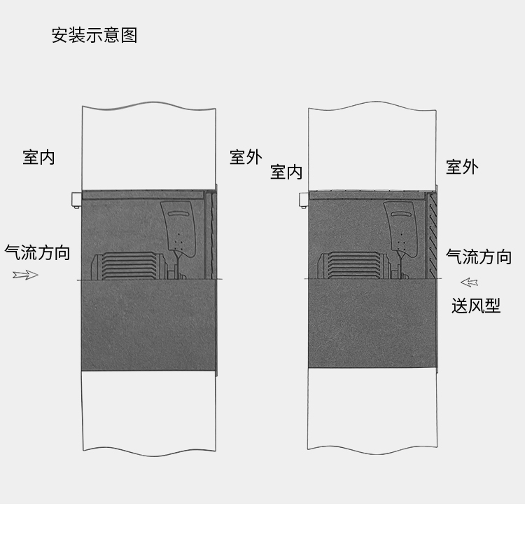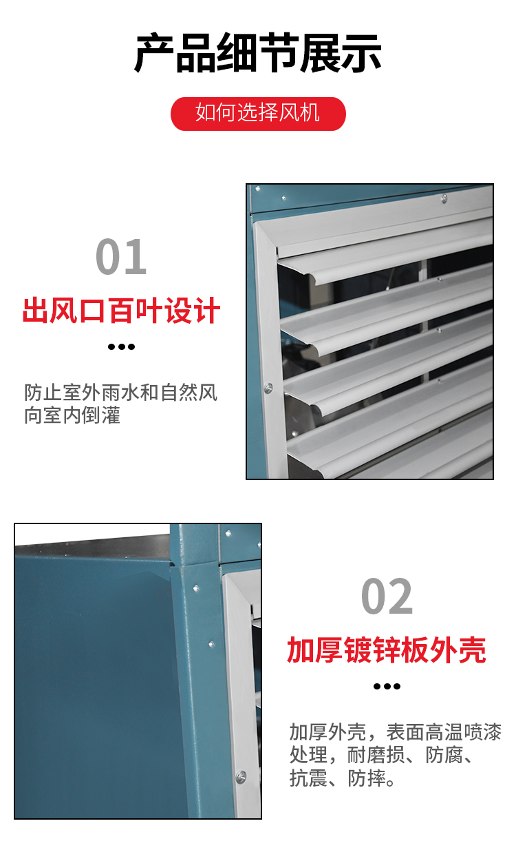 殼體:方形鍍鋅鋼板金屬外殼,出風口配設(shè)鋁制重力式止回閥